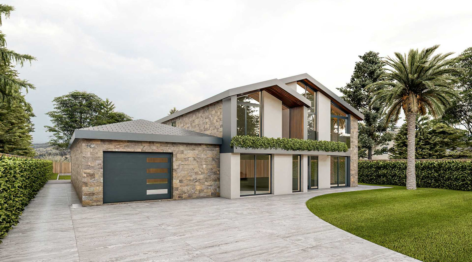 To fulfill this vision, we presented two distinct design options, each offering a unique interpretation of the client's preferences. Option 1 showcases an exterior characterized by a harmonious blend of brown brick, metal cladding, wood cladding, and render, creating a dynamic and visually appealing facade. On the other hand, Option 2 features a predominantly stone cladding exterior, evoking a sense of classic grandeur with a modern twist.